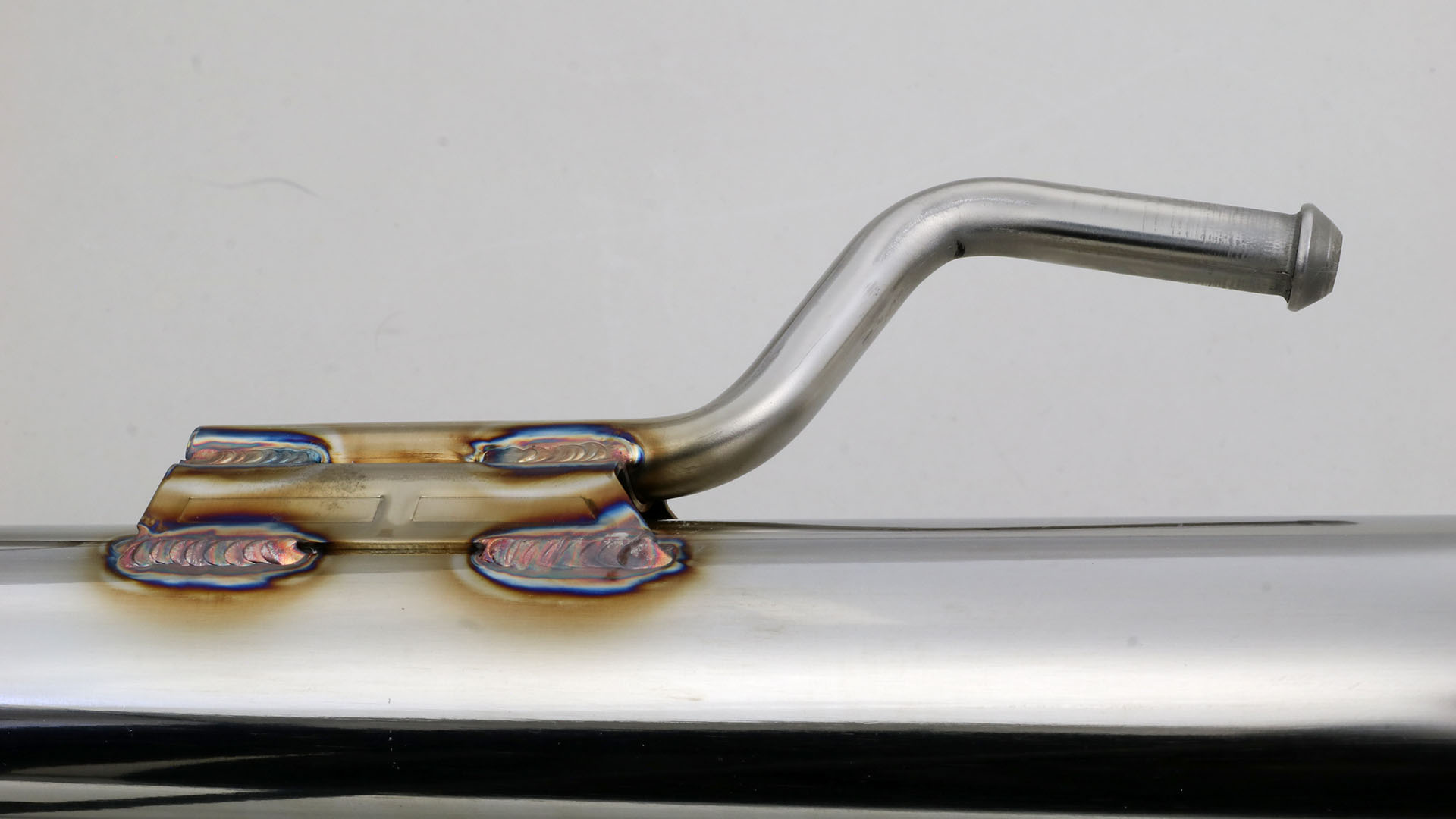 マフラー本体を支える、取り付けステー部の溶接方法もGANADORのこだわり。ステーを直接溶接せず、専用部品で応力を分散し、安全性を高めています。