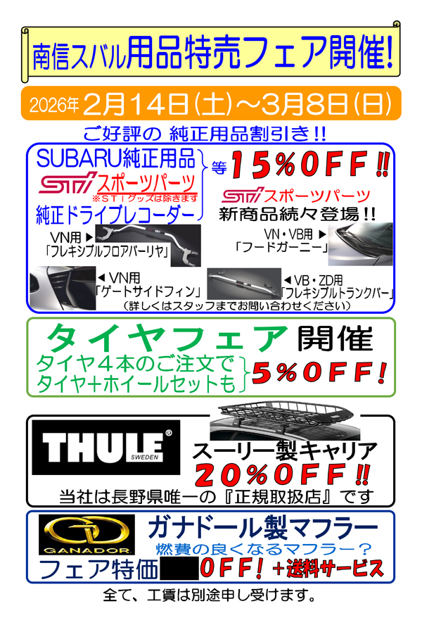 2/14(土)~3/8(日) 長野|南信スバル|用品特売フェア