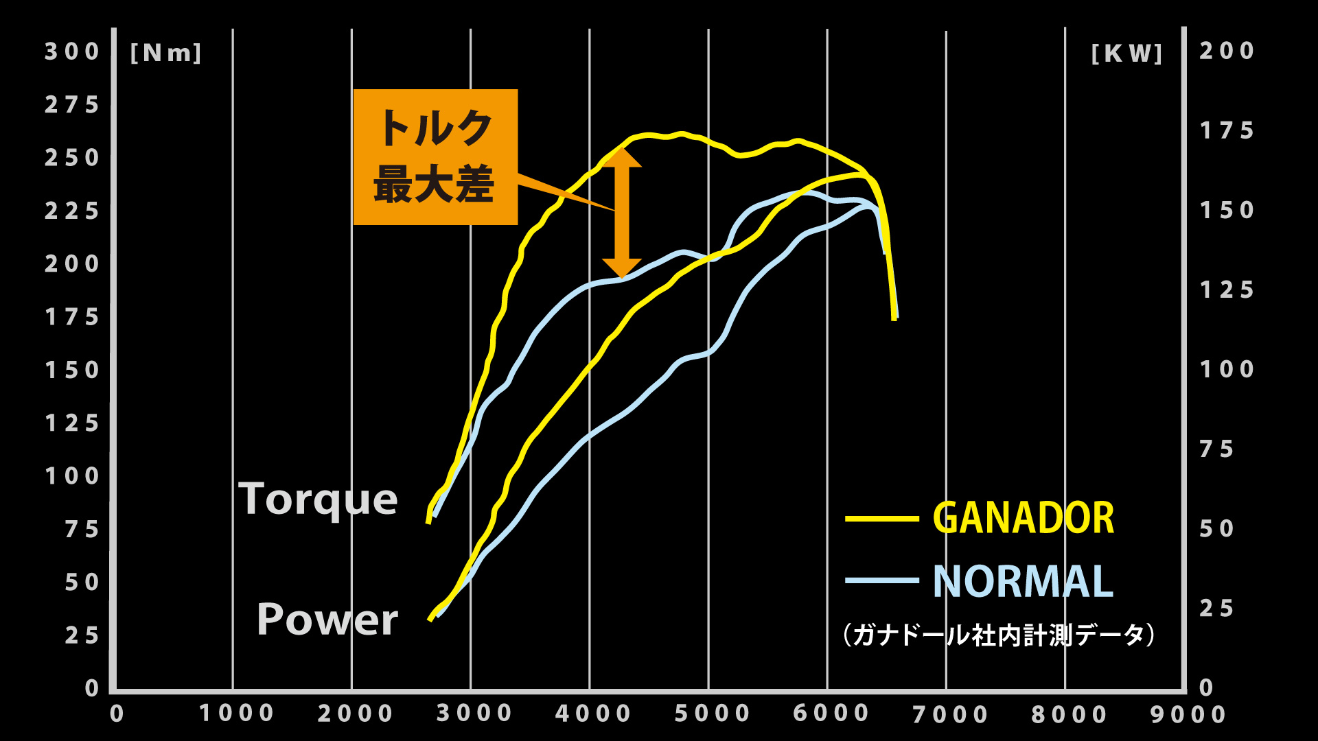 ● 特に加速時のレスポンスに影響するトルクが、低中回転域からしっかりとノーマルマフラーを上回っており、これはガナドールの大きな特徴の一つです。
