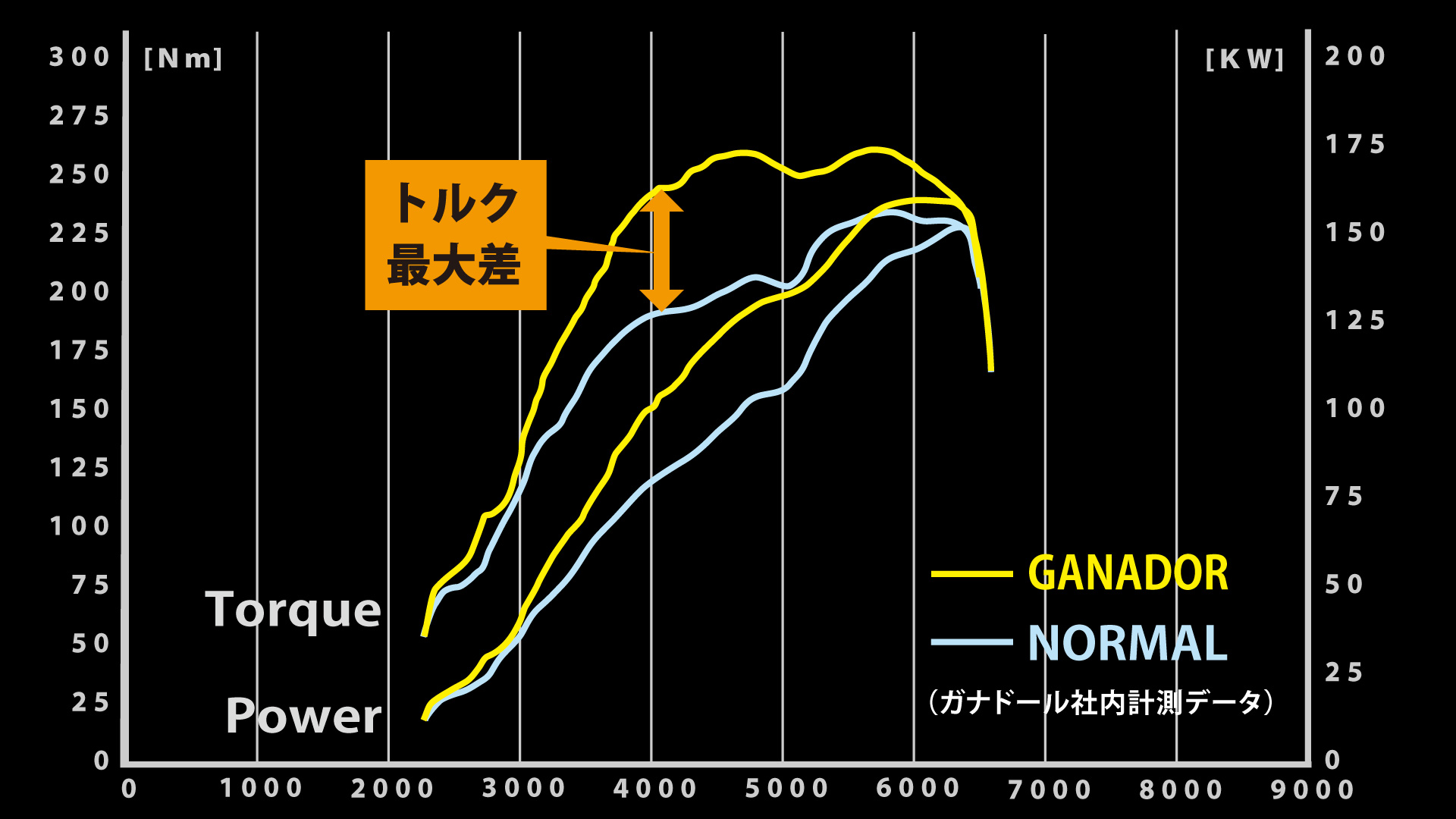 ● 更に 4,080 rpm時のトルク最大差は、なんと+5.4 kgf・m(約27%UP)達成。